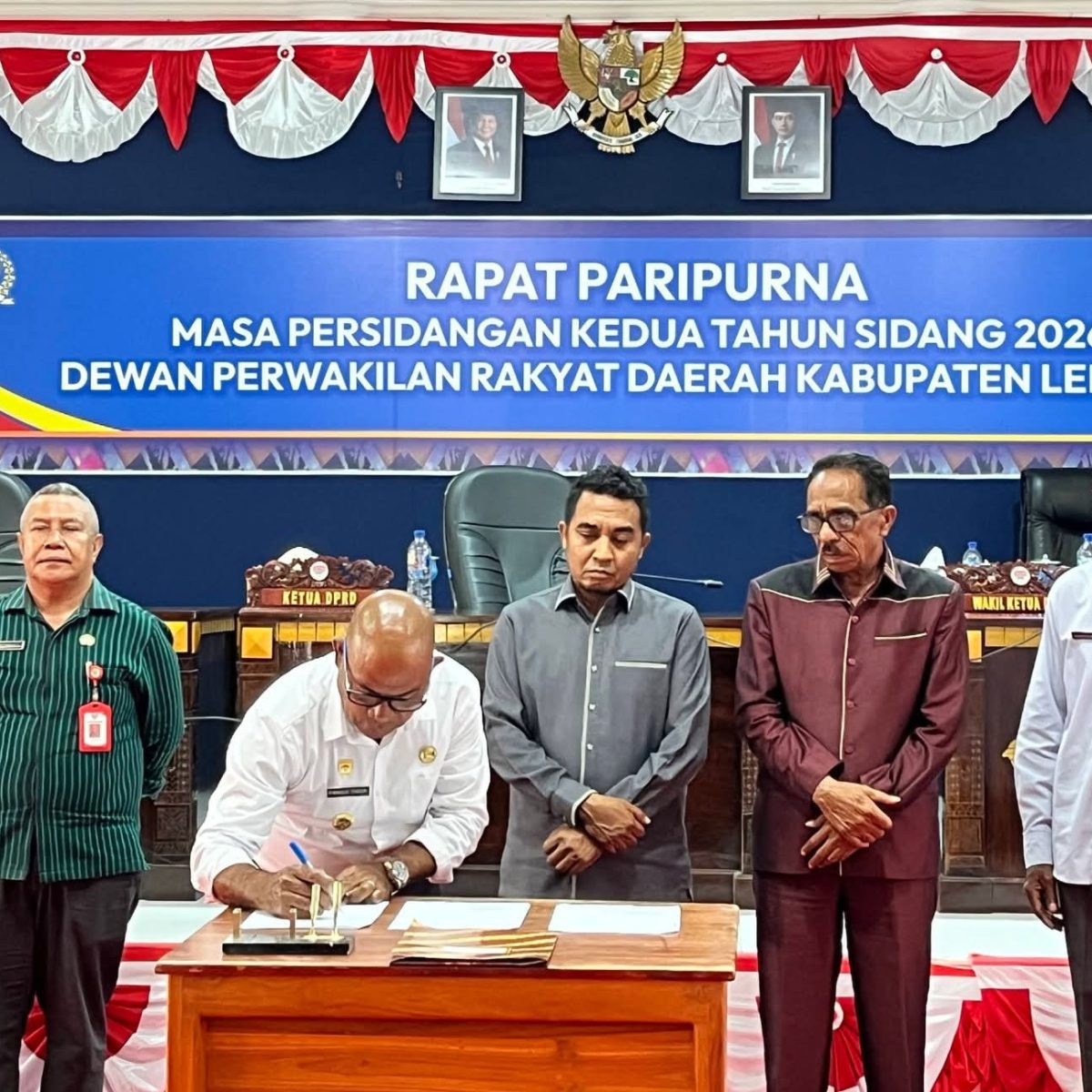 Penandatanganan dilakukan oleh Bupati Lembata, P. Kanisius Tuaq, bersama pimpinan DPRD, didampingi Asisten Pemerintahan dan Kesejahteraan Rakyat serta Sekretaris Dewan Kabupaten Lembata. Momen tersebut turut disaksikan langsung oleh para anggota DPRD dan pimpinan Organisasi Perangkat Daerah (OPD).