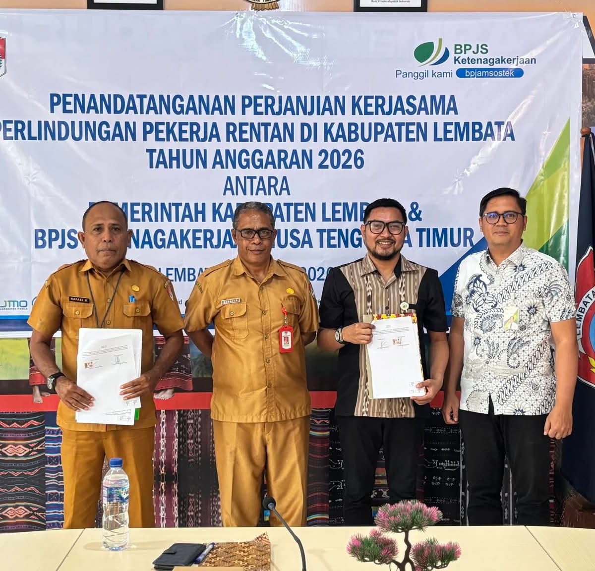 KORANINFOKINI.COM, LEMBATA — Pemerintah Kabupaten Lembata bersama Badan Penyelenggara Jaminan Sosial (BPJS) Ketenagakerjaan Kantor Cabang Nusa Tenggara Timur resmi menandatangani Perjanjian Kerja Sama tentang penyelenggaraan Program Jaminan Kecelakaan Kerja (JKK) dan Jaminan Kematian (JKM) bagi pekerja rentan di Kabupaten Lembata.