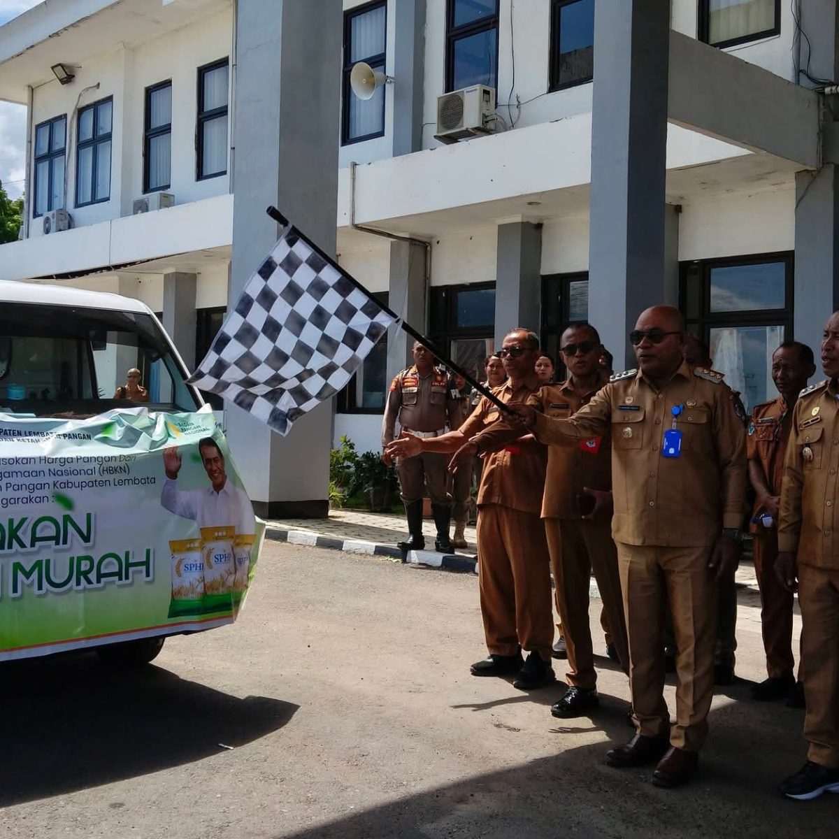 Pelepasan Gerakan Pangan Murah ditandai dengan keberangkatan kendaraan operasional yang membawa bahan pangan untuk didistribusikan kepada masyarakat. Pada bagian depan kendaraan terpasang spanduk bertuliskan “Gerakan Pangan Murah” sebagai penanda dimulainya penyaluran bahan pangan murah kepada masyarakat di Kabupaten Lembata.